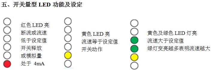 將流開關(guān)裝好,使介質(zhì)以需要監(jiān)測(cè)的流速流動(dòng),擰開面板上的螺絲,調(diào)整電位計(jì), 使第一個(gè)綠色LED怡好變亮。此后當(dāng)流速低于當(dāng)前值時(shí),開關(guān)就釋放(紅燈亮)。若要使開關(guān)點(diǎn)比當(dāng)前流速小,可調(diào)整電位計(jì)(順時(shí)針旋轉(zhuǎn)螺絲刀)使綠色 LED多亮一些。