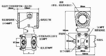 例:TDSB3051差壓變送器,量程0-300kpa兩線制4~20 mA DC信號(hào)輸出,法蘭接頭排氣/排液閥、隔離膜片均為316不銹鋼智能表顯示器,管裝平支架,泄放閥在壓力室側(cè)面的橢圓接頭內(nèi)螺紋NPT 1/2