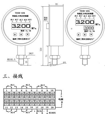 TDSB-484ZL系列壓阻式智能數(shù)顯壓力變送器、控制器是集壓力測量、顯示、控制于一體的多功能產品。該產品為全電子數(shù)字技術。結構,前端采用帶隔離膜充油芯體的壓阻式壓力傳感器,輸出信號由高精度、低溫漂和高可靠性的放大電路轉換為標準信號。它使用方便,參數(shù)在儀表盤面設定,廣泛應用于電力、自來水、水處理、石油、化工、冶金等行業(yè),對流體介質的壓力進行監(jiān)控,是指針電接點壓力表的理想替代產品。